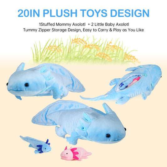 Axolotl Plush with 2 Small Axolotl Stuffed Animals, 3Piece Soft Axolotl Stuffed Animals Zippers Playset, Axolotl Mom with Babies, Unique Plushie Toys Model Dolls Collection for Kids
