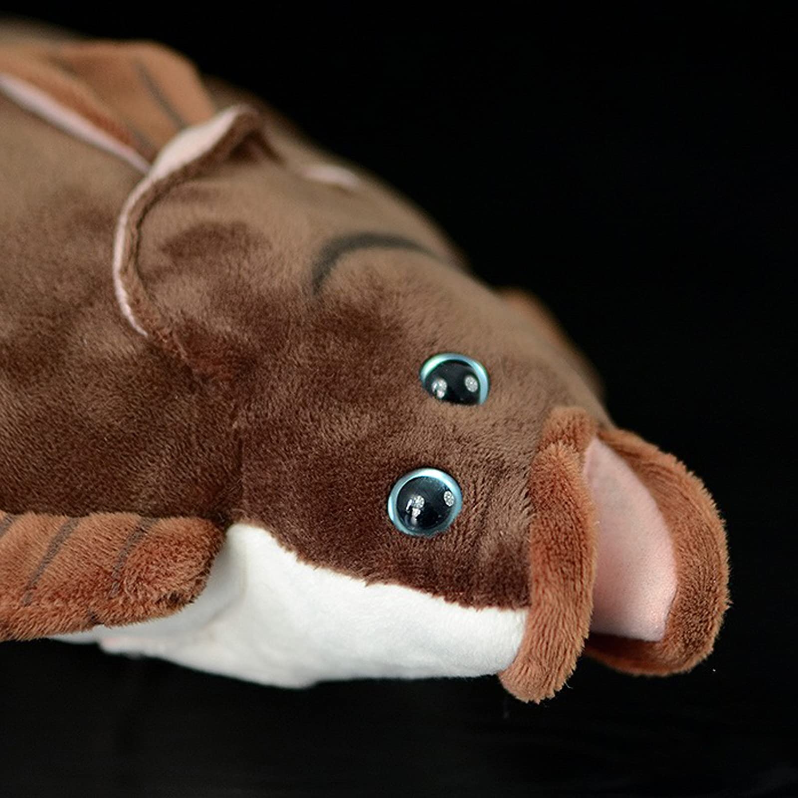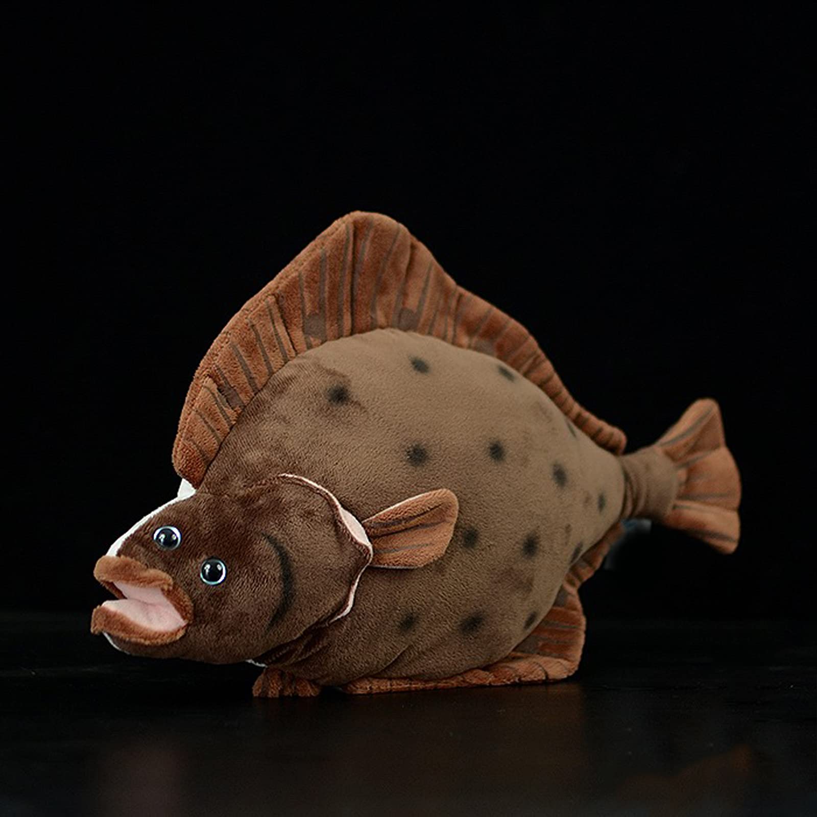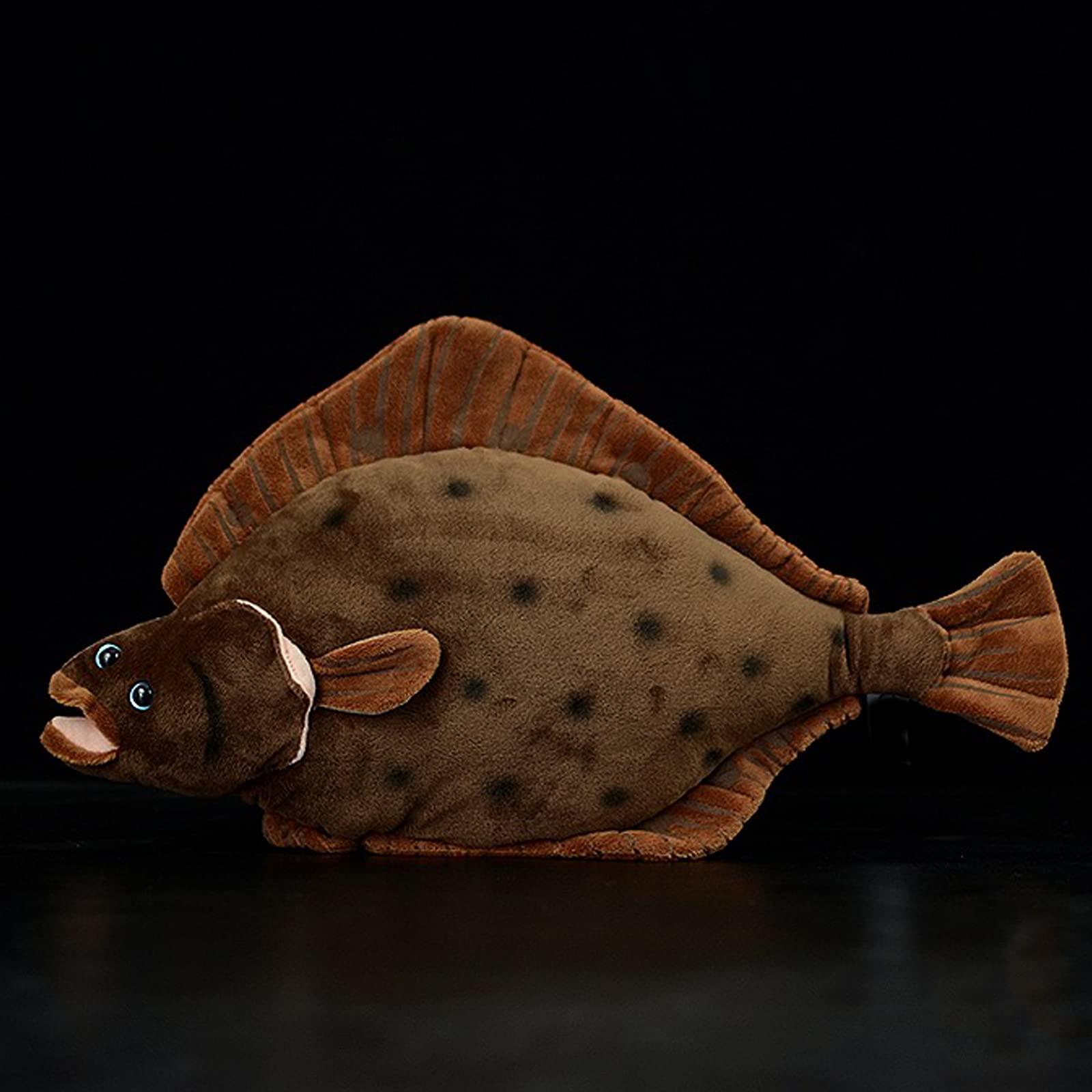Dieses Plattfisch-Plüschtier ist handgefertigt. Es ist eine Figur, die gut mit Baumwolle ausgestopft ist, was bedeutet, dass sie leicht matschig ist. Das Fell ist glatt und weich, die Gesamtform ist realistisch und das Gesichtsdesign ist einzigartig, sehr realistisch. Die intelligenten Augen machen es lebendiger und lebensechter.