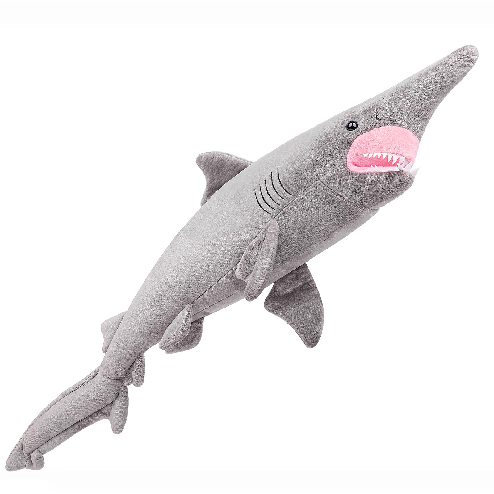 Dieses Teufelshai-Plüschtier ist handgefertigt. Es ist eine Figur, die gut mit Baumwolle ausgestopft ist, was bedeutet, dass sie leicht matschig ist. Das Fell ist glatt und weich, die Gesamtform ist realistisch und das Gesichtsdesign ist einzigartig, sehr realistisch. Die intelligenten Augen machen es lebendiger und lebensechter.